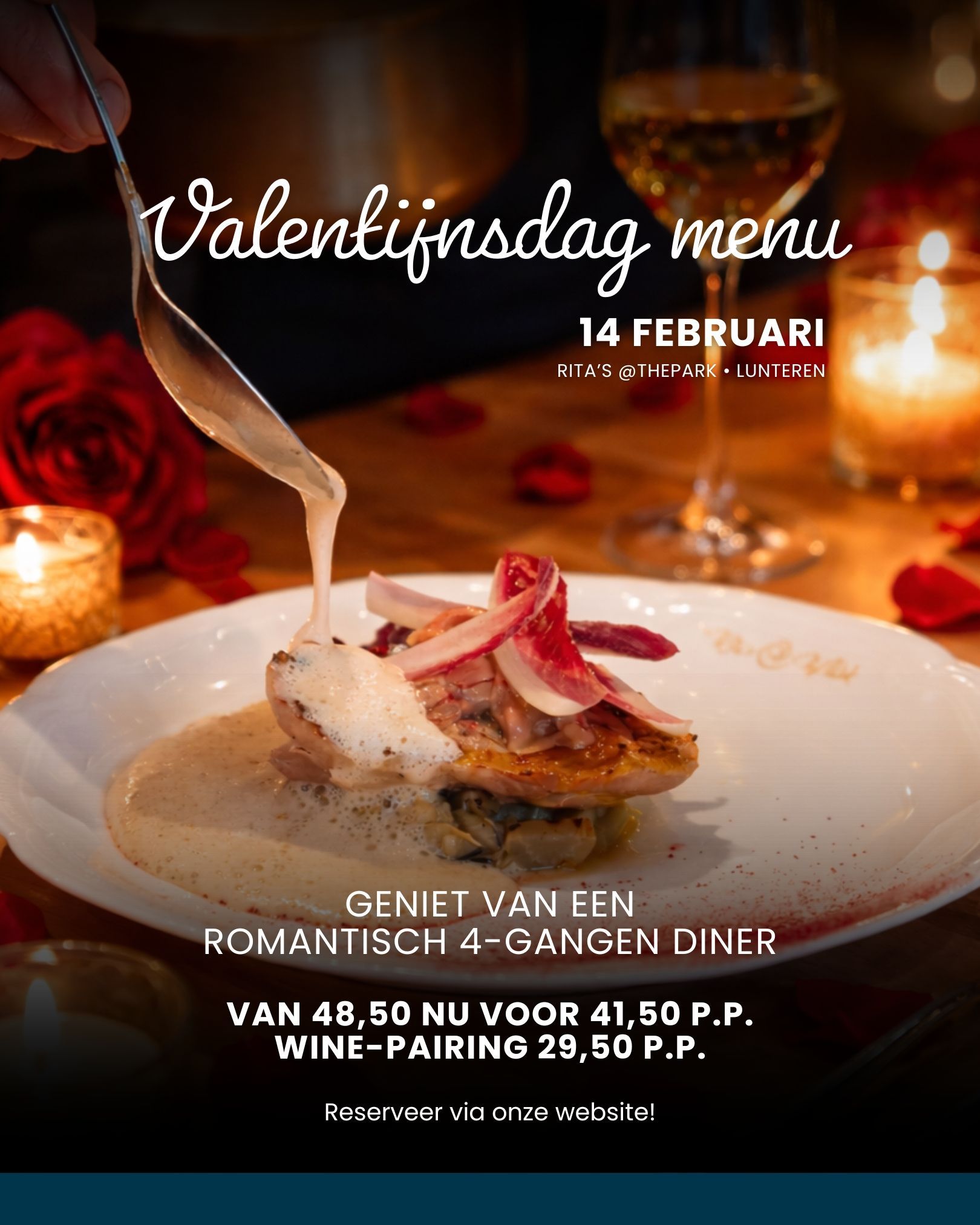 Geniet op Valentijnsdag van een romantisch 4-gangen diner bij Rita's! Optioneel met wine-pairing voor 29,50.